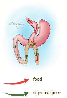 This operation was performed for the first time in 1997 – with the idea of ​​finding a simpler but equally effective method as gastric bypass. The operation was initially not accepted, because by making only one connection between the stomach and the intestine, there is a possibility that there will be a bile burn in the esophagus and after 30 years, the development of an oncological disease in the esophagus is possible. Currently, the development of oncology has not been proven, however, in some cases, there is bile in the esophagus. The operation proved to be just as effective for weight loss and disease treatment as Gastric Bypass. During this, a small stomach is created, but unlike Gastric Bypass, it is longer so that bile is less likely to flow into the esophagus. The small intestine is attached to the small stomach, thus the end of the operation is reached in a shorter time. The risk of surgical complications is lower than Gastric Bypass. The mechanism of satiety is the same as Gastric Bypass.