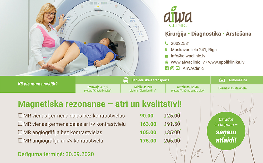 Izdrukā kuponu un saņem atlaidi magnētiskās rezonanses izmeklējumiem AIWA Clinic.